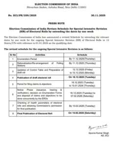 बता दें कि इसके पहले SIR की अंतिम तिथि 4 दिसंबर तय थी, लेकिन केवल चार दिन ही शेष थे। कई जिलों से फील्ड स्टाफ और BLO द्वारा समय की कमी की रिपोर्ट मिलने के बाद आयोग ने यह बड़ा निर्णय लिया। अब अंतिम तिथि 11 दिसंबर कर दी गई है। इसके साथ ही घर-घर सत्यापन, बूथों के पुनर्गठन, ड्राफ्ट रोल तैयार करने और क्लेम-ऑब्जेक्शन जैसे सभी चरण अब संशोधित तिथियों के अनुसार पूरे होंगे।
