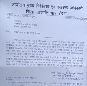 जिला मुख्य चिकित्सा एवं स्वास्थ्य अधिकारी (सीएमएचओ) जांजगीर-चांपा ने पामगढ़ स्थित जी.एल.डी. हॉस्पिटल के संचालक के विरुद्ध नर्सिंग होम एक्ट एवं पी.सी.पी.एन.डी.टी. अधिनियम के प्रावधानों के उल्लंघन करने पर यह आरोप में यह कारण बताओ नोटिस जारी किया है।