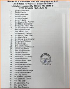 पश्चिम बंगाल विधानसभा चुनाव 2026: बीजेपी ने जारी की स्टार प्रचारकों की लिस्ट, स्टार प्रचारकों की लिस्ट में 40 नाम शामिल