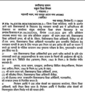 रायपुर। स्कूल शिक्षा विभाग ने बड़े कदम उठाते हुए तीन विकासखंड शिक्षा अधिकारियों को तत्काल प्रभाव से निलंबित कर दिया है। यह कार्रवाई स्वच्छता सामग्री क्रय में अनियमितता और जांच के दौरान नियमों के उल्लंघन के मामले में की गई है। आदेश नया रायपुर स्थित स्कूल शिक्षा विभाग, मंत्रालय से जारी किया गया है।
